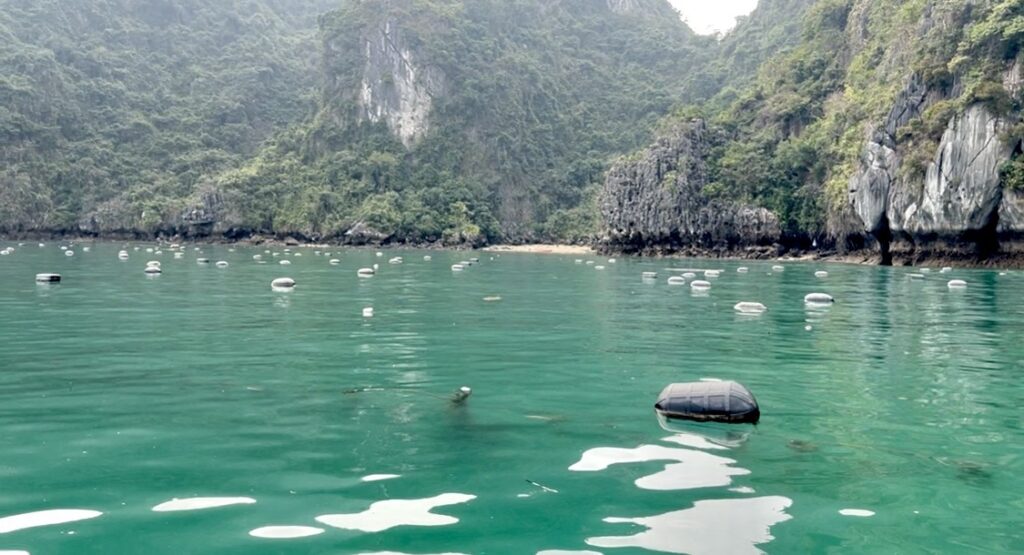 *These farms are typically located in isolated, calm, and scenic areas of the bay,, where they are protected from strong currents. The small buoys seen from tourist boats mark the locations of suspended underwater cages, where thousands of oysters are cultivated, cleaned, and checked for pearls over a period of 1–5 years. The farms use a combination of Japanese technology and traditional Vietnamese techniques, where a membrane is implanted into the oyster to stimulate pearl growth.
