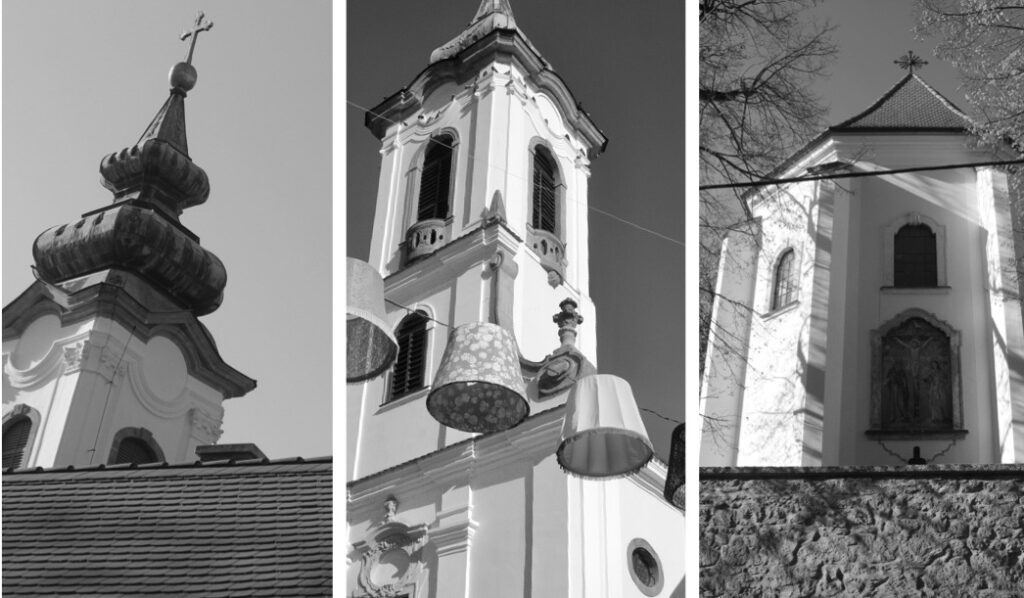 Szentendre in monochrome tells its story in quiet tones. Done as a triptych: first, the churches—timeless, still, and grounding the town in history.