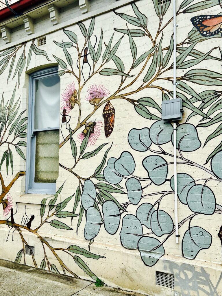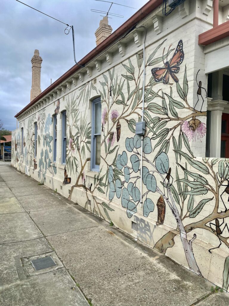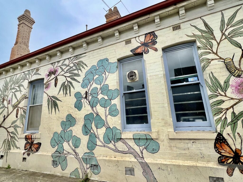 These are the windows of the Wanderers’ mural on High St, Thornbury. Artwork is by Tom Civil painted in 2014.