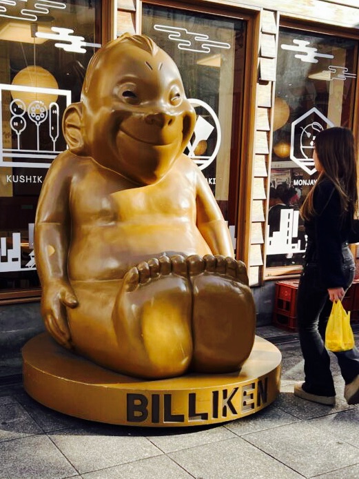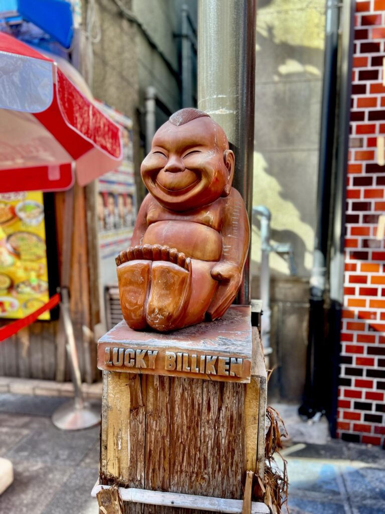 Billiken is usually shown seated, with pointy ears and a cheeky grin. Locals believe that rubbing the soles of Billiken’s feet brings luck, so you’ll often see them polished shiny from countless wishes.