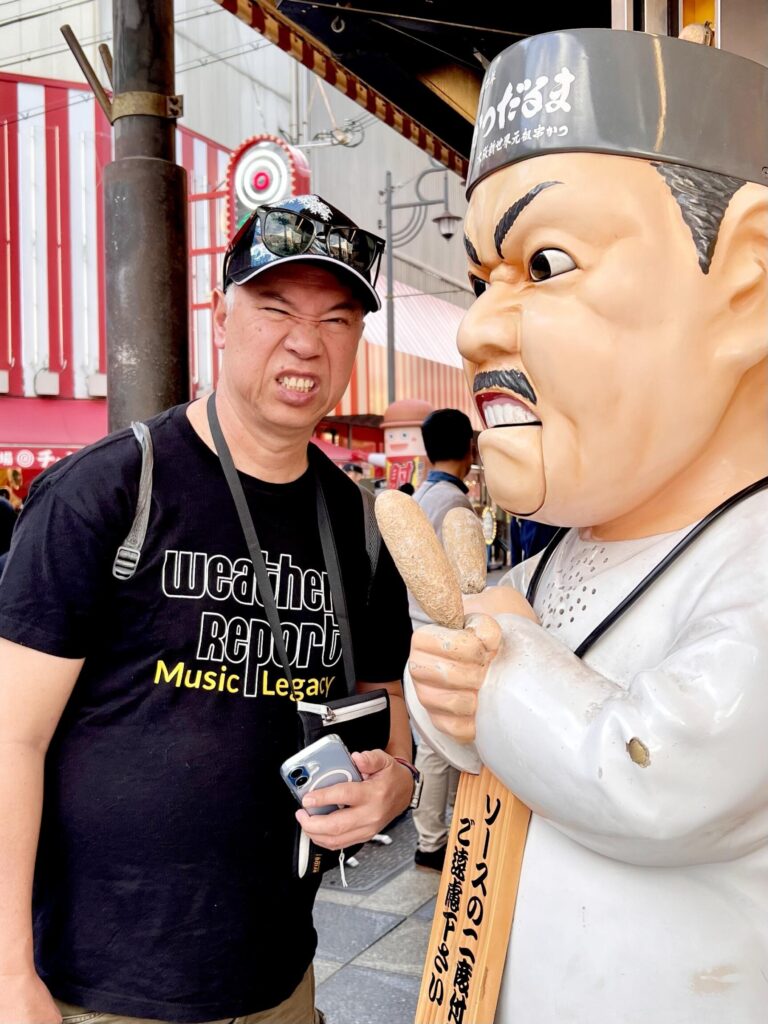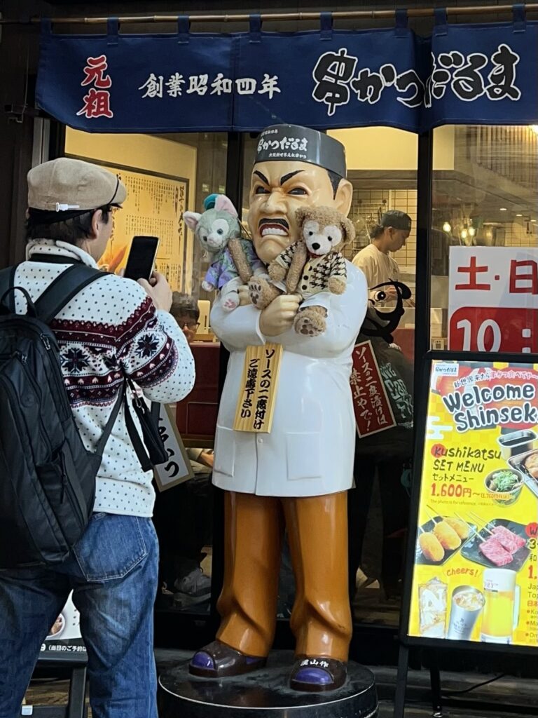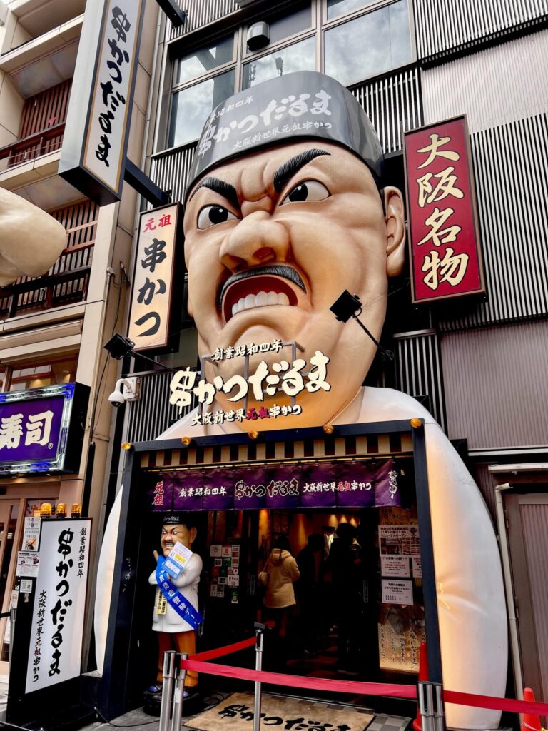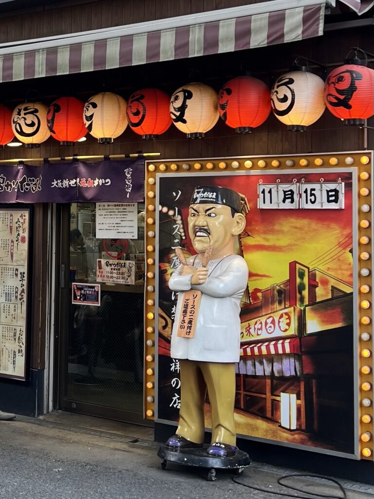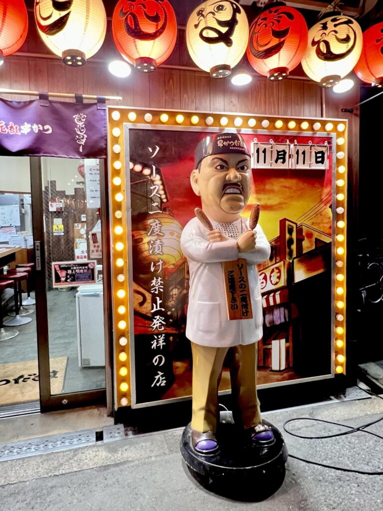 Still in Osaka, I noticed grumpy-looking chef statues guarding doorways and even one on top of a building. With crossed arms, furrowed brows, and a no-nonsense stare, this character represents the spirit of the shokunin, the dedicated craftsman who takes food seriously. He is the mascot for Kushikatsu Daruma, a famous restaurant chain specializing in deep-fried skewers.